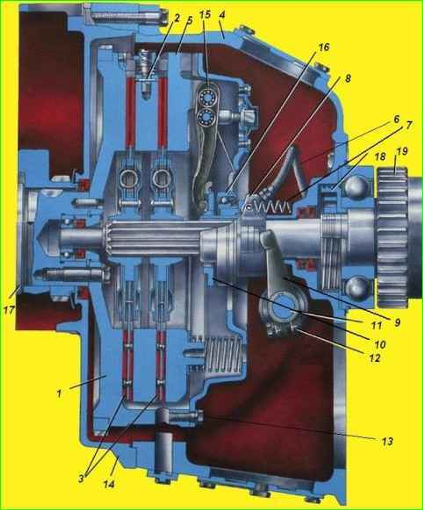 Сцепление в сборе: 1 - маховик; 2 - средний ведущий диск; 3 - ведомый диск; 4 - картер сцепления; 5 - нажимной диск; 6 - шланг для смазки; 7 - пружина муфты выключения сцепления; 8 - муфта выключения сцепления; 9 - вилка; 10 - упорное кольцо; 11 - вал вилки выключения сцепления; 12 - болт крепления вилки; 13 - болт крепления кожуха сцепления; 14 - кожух маховика; 15 - оттяжной рычаг; 16 - подшипник муфты; 17 - коленчатый вал