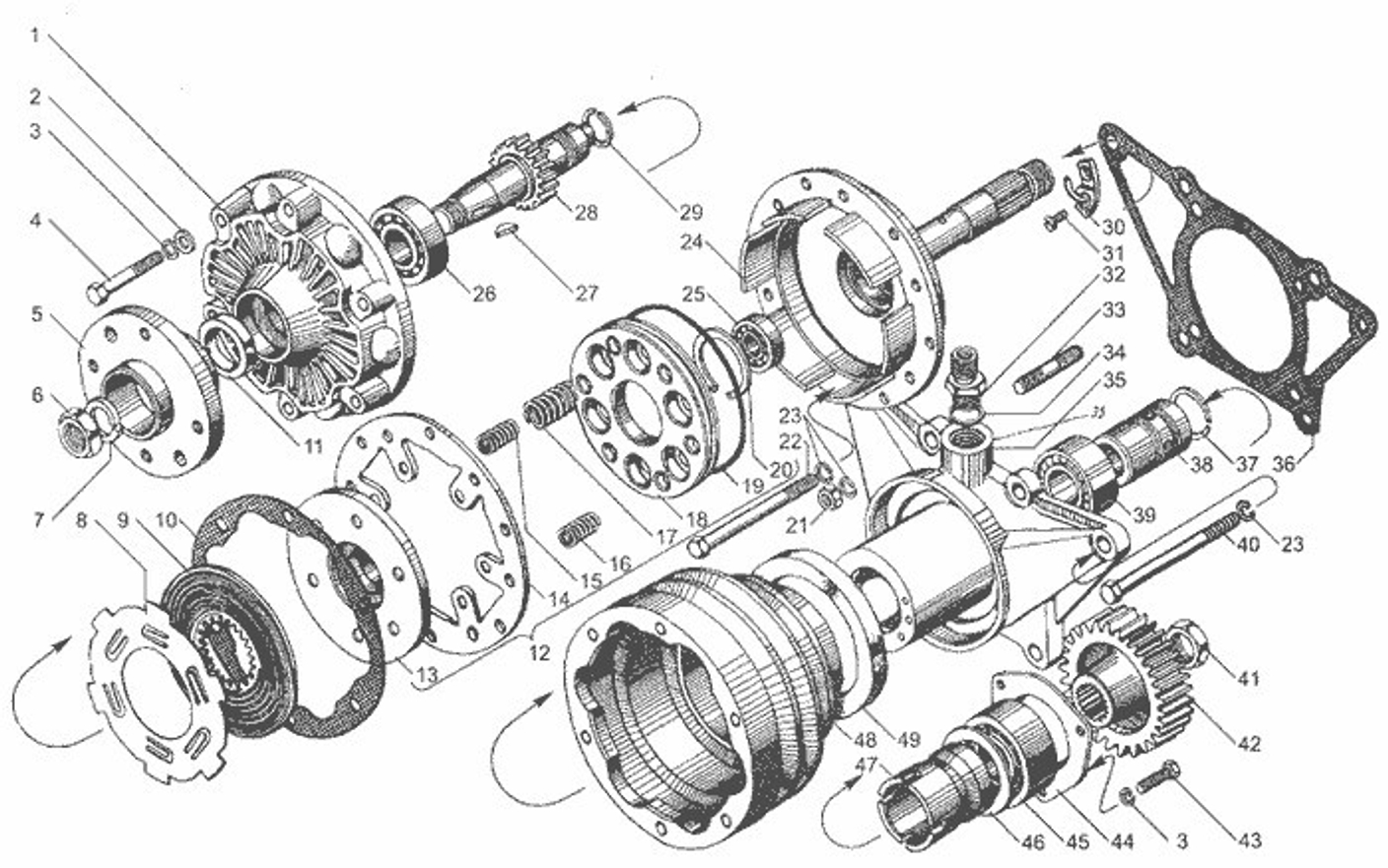 - 5. Отвернуть болты крепления и снять с привода крышку 2 (см. рис. 1) в сборе со ступицей и ведомым валом 25, извлечь из ведущего вала 18 пакет ведущих и ведомых дисков 4 и 5, а также поршень 30 в сборе с упором 31 и нажимной обоймой 27.