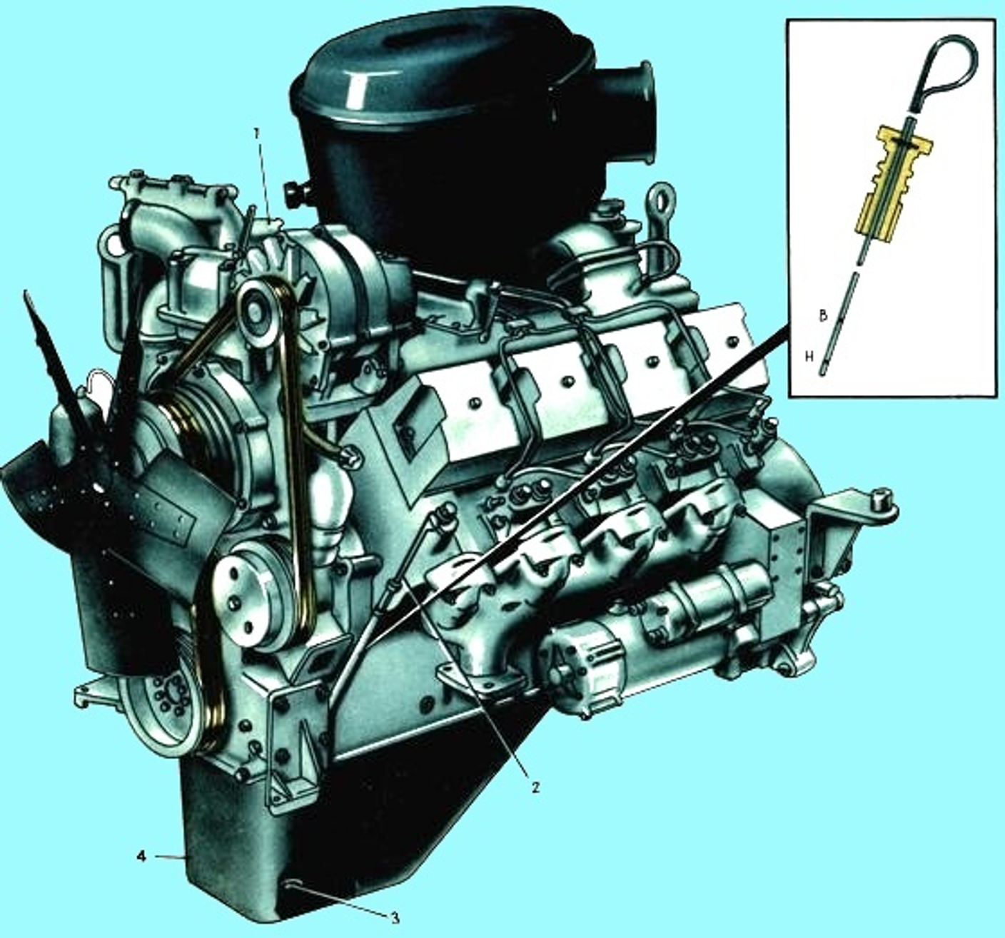 Если уровень близок к метке «Н», долейте в заливную горловину 1, расположенную в передней части двигателя, за гидромуфтой привода вентилятора, свежее масло до нормы.