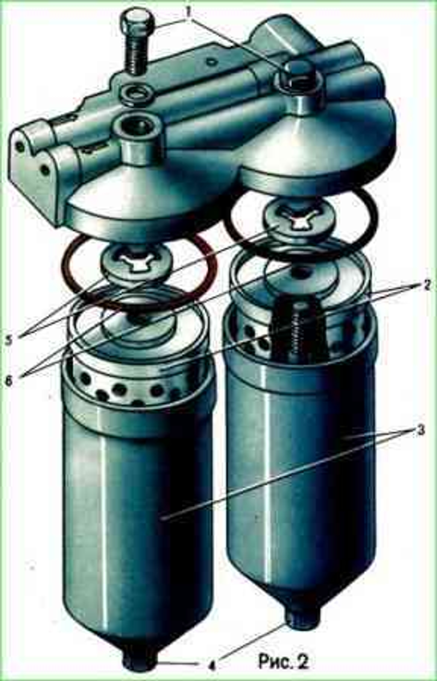 Фильтра тонкой очистки топлива: 1 - болты крепления колпаков фильтра; 2 - фильтрующие элементы; 3 - колпаки; 4 - сливные пробки; 5, 6 - шайбы и прокладки