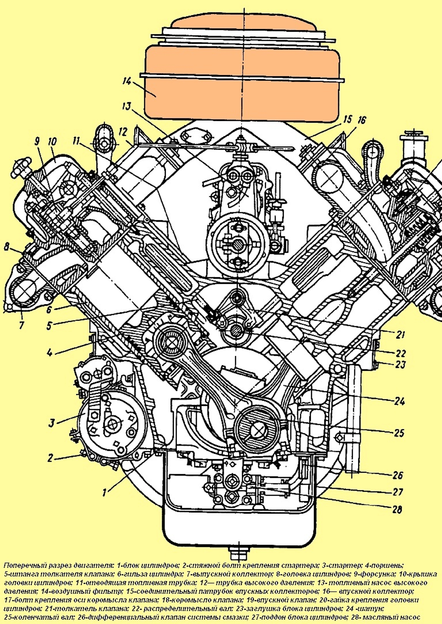 Повернув двигатель на стенде картером маховика вниз, снимаем поддон 27, масляный насос 28 с дифференциальным клапаном 26 и трубками.