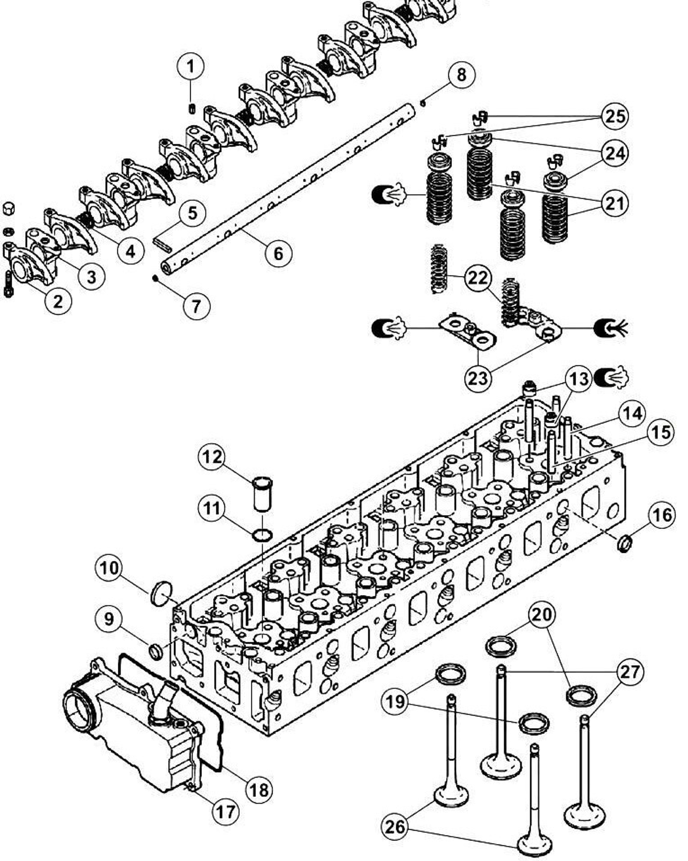 - 1. Поставить манжеты (13) на направляющие втулки выпускных клапанов.