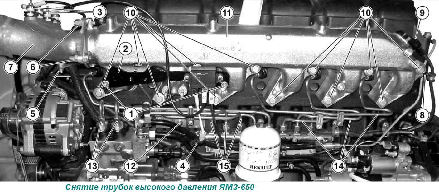 Снять трубки высокого давления рампы подводящие (13) (650.1111673), трубки высокого давления задние в сборе (14) (650.1112463) и трубки высокого давления передние в сборе (15) (650.1112433).